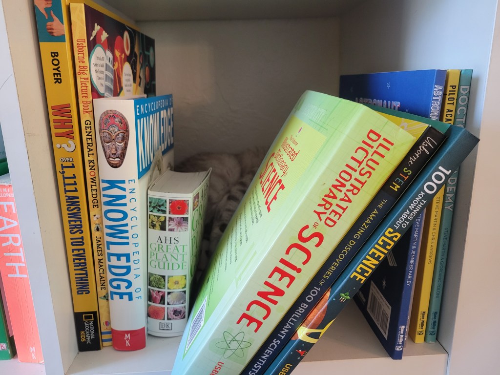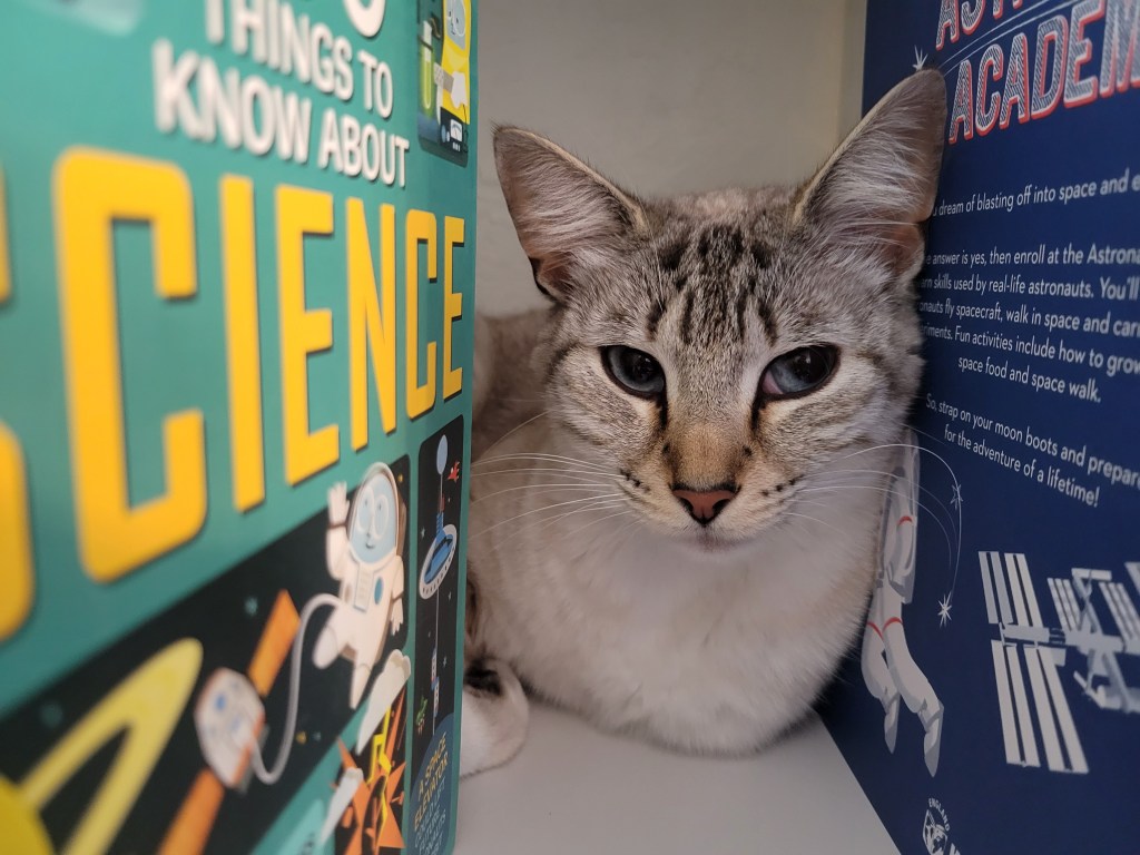 Edie is a quiet cat. We’re used to our animals “talking” to us, but she’s only just starting to talk back to us. She loves curling up in the coziest places—bookshelves being a current favorite—and while she’s incredibly affectionate, she’s also the biggest scaredy-cat.
