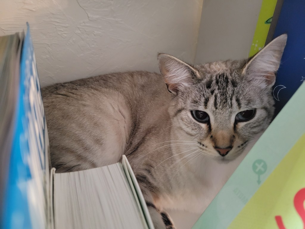 She also has her own backstory—which I hope to tell soon—but she was one of the five kittens born under our daughter’s bed in 2024.