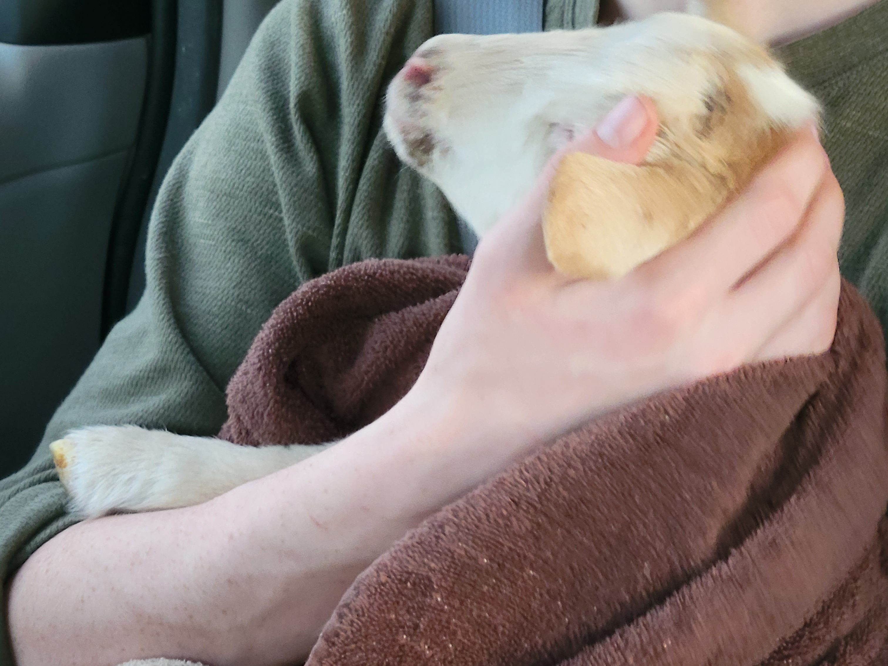 Since he was only a tiny one-week-old lamb, we borrowed a towel from our friends, and my oldest held him for the short ride.